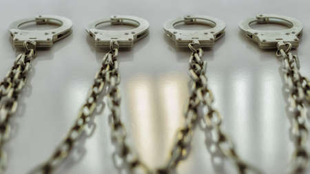 Chain and lock on hand. Arrest of a criminal. Handcuffs on the prisoner. Under the ban. Caught thief.