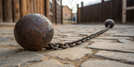 An old rusty ball and chain rests on a cobblestone path in a historic area as shadows grow long.