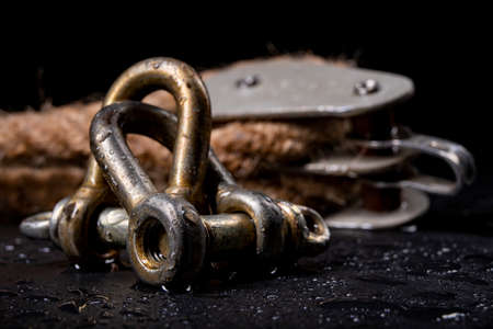 Wet shackles and heavy jute rope wrapped on rollers in a sailing pulley. Accessories used on yachts for sailing in the sea. Dark background.