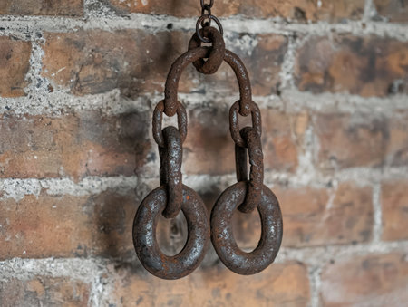Rusty metal chains hanging on a brick wall
