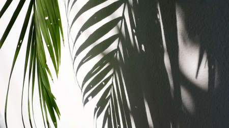 Tropical palm leaves with shadows on white concrete wall abstract blurred background.