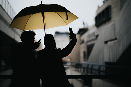 Shadows of two people using smartphones are projected on brick wall behind outdoor wooden table with two chairs, suggesting conversation or social interaction in casual setting. Modern communication