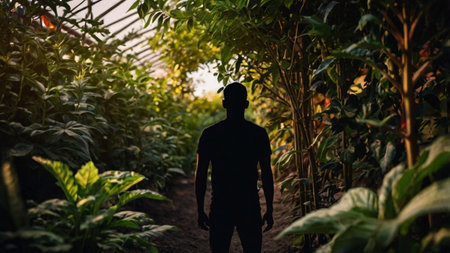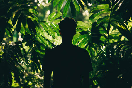 Dark silhouette of a man standing among vibrant green leaves, creating a sense of mystery, peace, or nature connection.