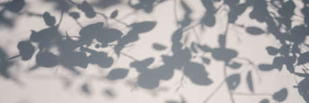 Shadow of leaves tree on white background. Sun day. Web banner, copy space.