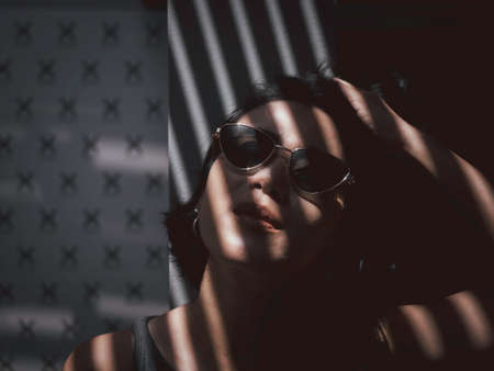 Beauty Asian woman short hair wearing sunglasses and a grey tank top with strips of light and shadows on her face, shadows from the slatted roof.
