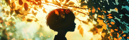 A child stands in silhouette, glowing softly against a backdrop of bright, colorful leaves as sunlight filters through. This peaceful moment captures youthful curiosity and nature's beauty.