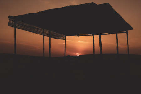 View of beautiful sunset at Desert Safari Camel Ride, a landmark for desert activities, in Al Wakrah, Qatar.