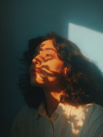 A young woman gazes thoughtfully as sunlight filters through a window, casting intricate shadows on her serene face in a tranquil room.