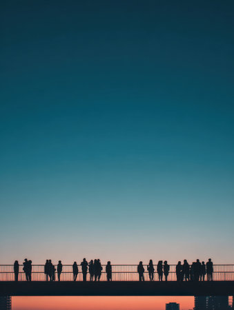 Silhouettes of people gather on a bridge during sunset, creating a serene scene against a fading blue sky transitioning to warm hues.