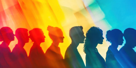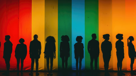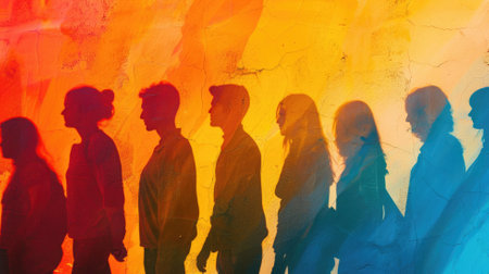 Colorful silhouettes create a stunning visual tapestry, casting shadows in vibrant hues. Ideal for exploring themes of unity, diversity, and artistic expression. Generated AI.