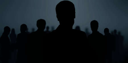 A crowd of people is silhouetted against a bright, undefined background. The image presents high contrast with dark figures and a stark white space. The composition emphasizes shadows and form, suggesting potential for use in a variety of visual concepts and artistic projects. Suitable for editorial and commercial applications.