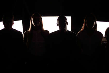 young business team sitting in computer room at night