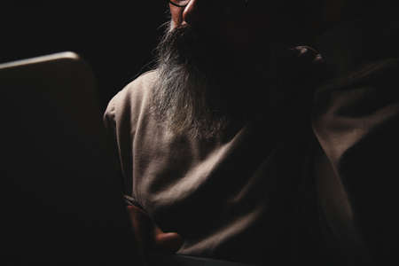 Anonymous man at a laptop at night. Internet addiction concept