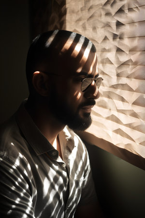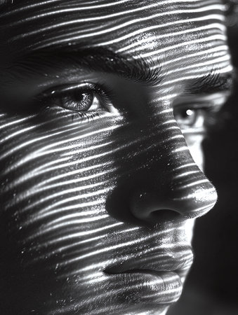 A striking profile of a person illuminated by light stripes, creating artistic shadows across the face. This image embodies beauty, emotion, and uniqueness.