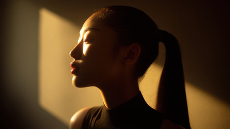 A striking profile of a young woman illuminated by soft sunlight creates a beautiful contrast of light and shadow, showcasing her grace and elegance.