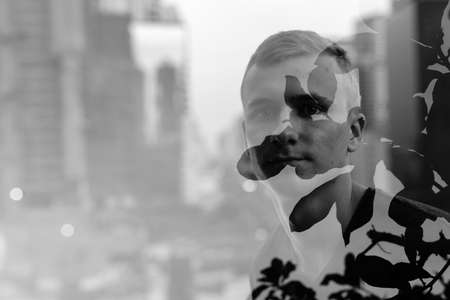 Portrait of young blond man against view of the city in multiple exposure