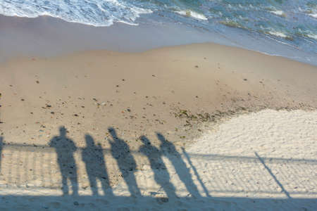 Shadows of group of people on the seashore. Concept of recollection, pandemic, departure to another reality.