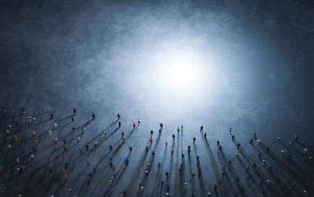 Crowd of diverse people walk to light. 3D illustration