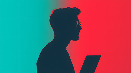 Silhouette of a man with a laptop on a colored background