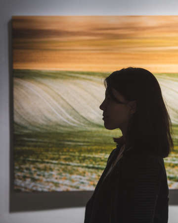 Lviv, Ukraine - May 11, 2019: woman looking at art picture in museum. modern