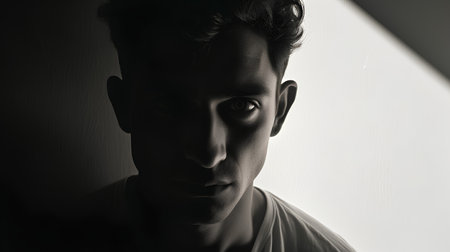 Portrait of a young man with shadows on his face. Black and white photo.