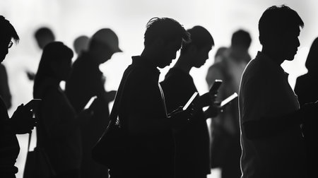 silhouettes of people in a crowd, faces glued to mobile phones in their hands