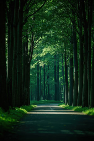 beautiful green forest landscape with road and trees in the morning light