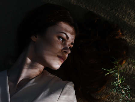 Red-haired Woman in a black dress lies on dry grass in nature in the forest