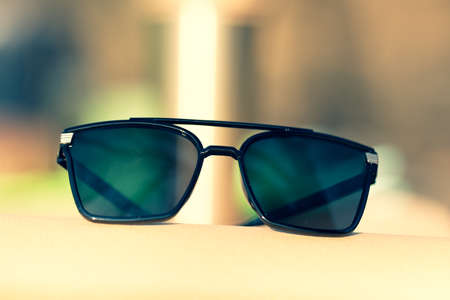 Classic sunglasses model with black lenses and white frame in a sunny day closeup . Selective focus