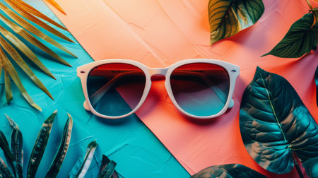 A stylish pair of white sunglasses placed among tropical leaves on a colorful background, creating a vibrant summer vibe.