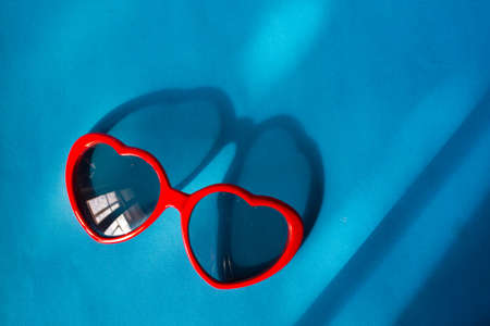 Summer background. Concept for summer and vacation. Red sunglasses by the pool in the background with blue water.