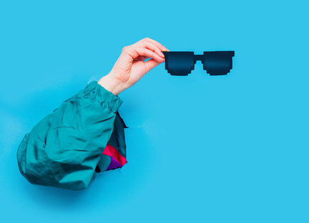 Female's hand in 90's style jacket holding sunglasses on blue background