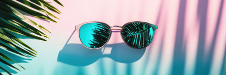 Stylish sunglasses adorned with palm leaves against a vibrant blue and pink background,.