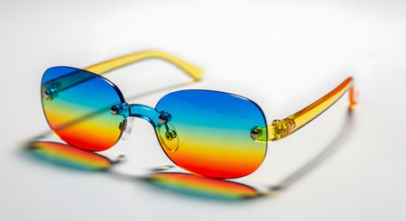 A pair of stylish, rimless sunglasses with rainbow gradient lenses, transitioning from blue to yellow to red. The fashionable eyewear has yellow translucent arms and is placed on a white surface, casting a colorful reflection.