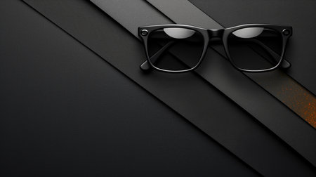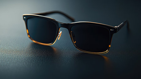 A pair of sleek black sunglasses with dark lenses rests on a textured dark surface, embodying modern fashion and elegance, ideal for lifestyle imagery.