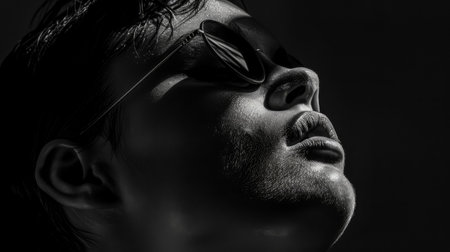 A striking black and white profile of a man wearing a hat and glasses, with dramatic lighting highlighting his features against a dark background.