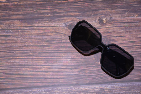 Sunglasses with black frame on wooden background. Selective focus.