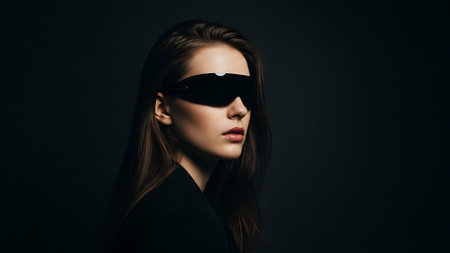 Portrait of beautiful young woman in black sunglasses on dark background.