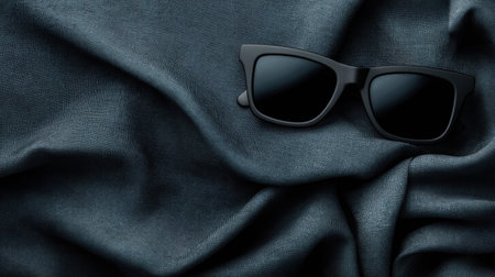 This image features a pair of stylish black sunglasses resting on soft dark fabric, perfect for highlighting fashion accessories in photography or marketing materials.