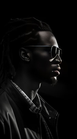 Confident and trendy look Portrait of handsome young African man in sunglasses leaning his head on hands and looking at camera while being in front of black background : Generative AI