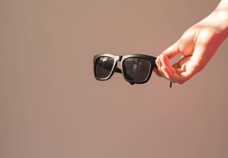 Sunglasses in the sun holds a young woman on a gray background, a shadow on his hand. Summer concept sunglasses mockup