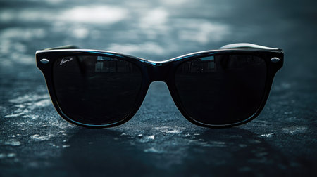 A pair of stylish black sunglasses rests on a reflective surface, illuminated by soft natural light. Ideal for summer fashion and outdoor leisure.