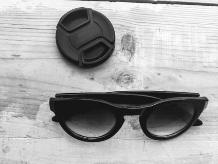 Single simple sun glasses on the wooden table with copy space, black and white color