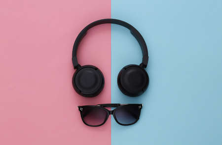 Black stereo headphones and sunglasses on a pink-blue background. top view