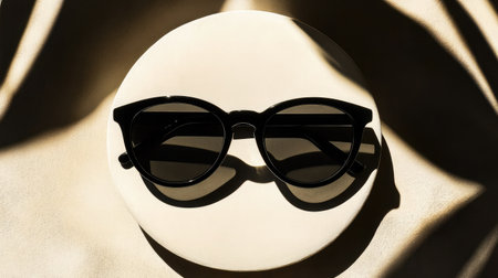 A pair of stylish black sunglasses rests elegantly on a table, illuminated by soft natural light and accompanied by gentle shadows, ideal for fashion enthusiasts.