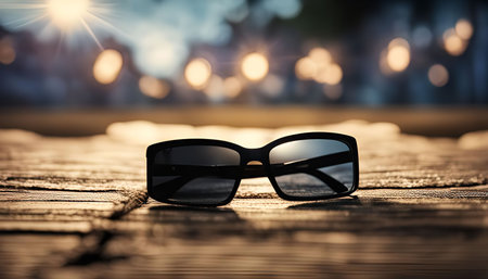 A pair of sunglasses lying on a wooden table, with a blurred background of lights and a sunset.