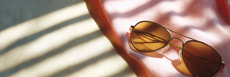 Sunglasses with sun shadows. Summer layout. Women's sunglasses. Sun protection. Copy space