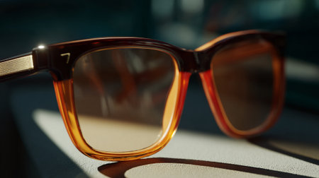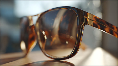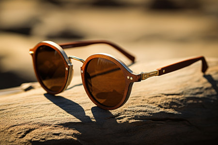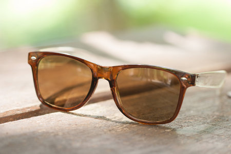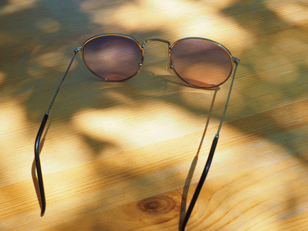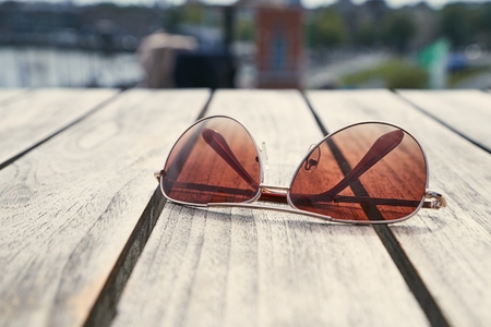 Beautiful light brown sunglasses on wood table in shallow depth of field.