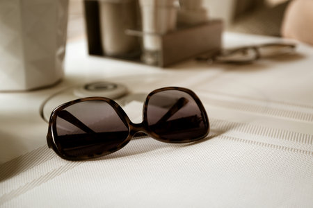 stylish sunglasses lying on table