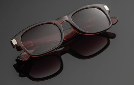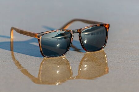 Classic Sunglasses design for men and ladies with brown lenses and brown frame shoot outside in a summer day closeup. Selective focus